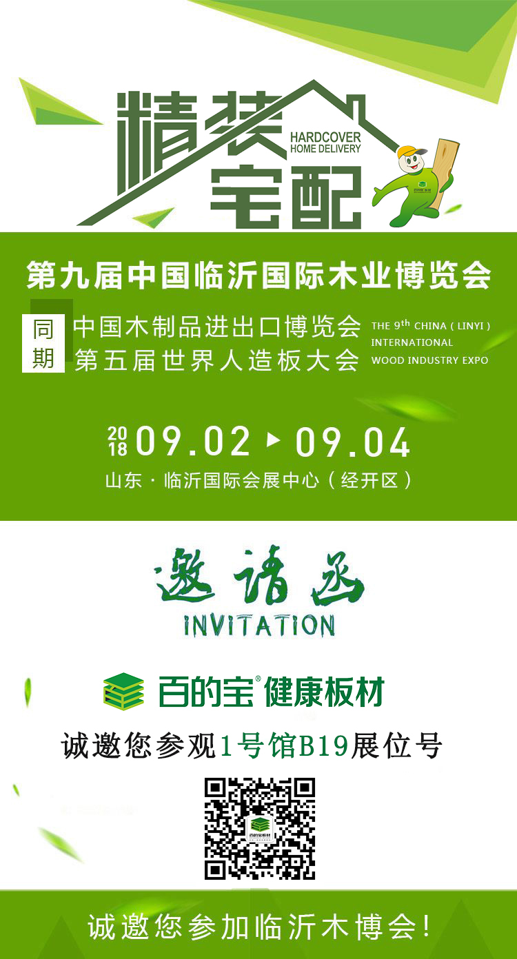 2018年9月2日-4日,第九屆中國臨沂國際木業博覽會將在山東臨沂國際會展中心(經開區)舉行,屆時百的寶板材將在1號館B19展位號,靜待您的蒞臨。
