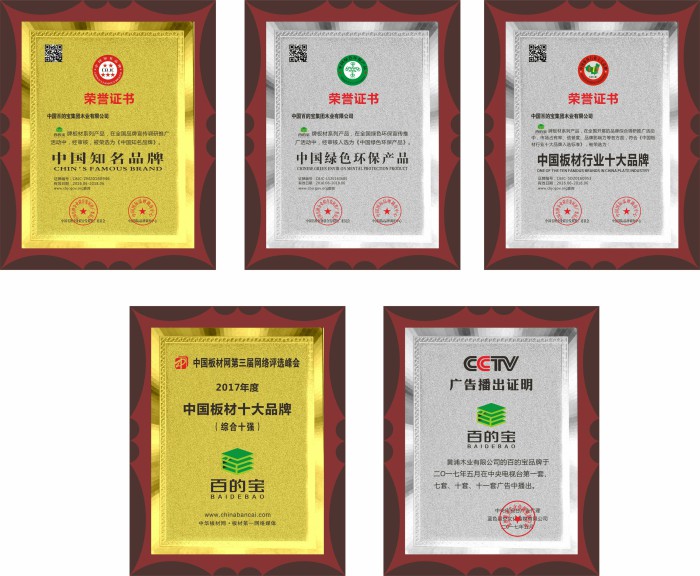百的寶板材的平整度、光潔度、膠合度、耐磨度等都是有口皆碑的,各項(xiàng)榮譽(yù)證書也都業(yè)界和消費(fèi)者的肯定。先后獲得“中國(guó)綠色環(huán)保產(chǎn)品”“中國(guó)板材行業(yè)品牌”“中國(guó)健康行業(yè)30強(qiáng)企業(yè)”“中國(guó)著名品牌”等稱號(hào)。????