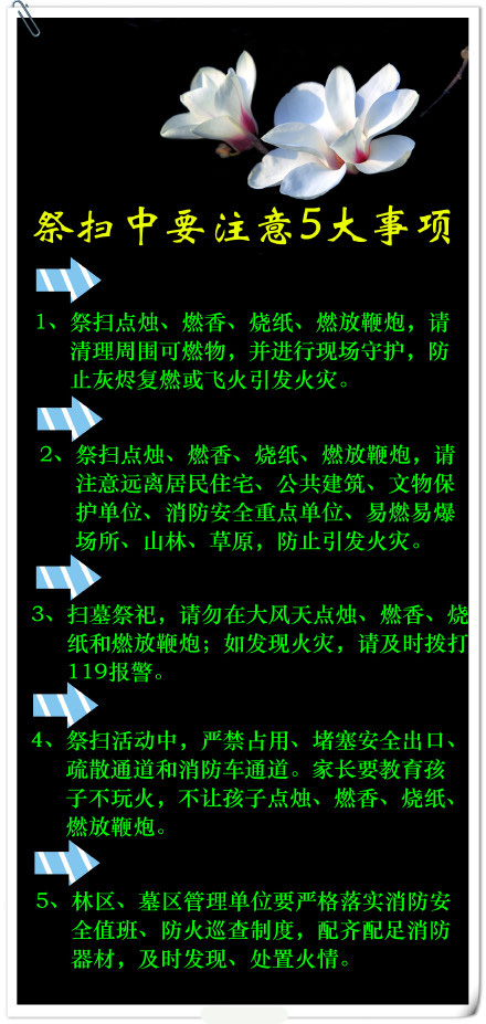 清明節掃墓祭祀,各地民俗雖不盡相同,但上香、燒紙錢、放鞭炮等現象比比皆是。每年這個時期,全國因燒紙不慎、余燼飛火等引發的火災事故頻頻發生,可謂“清明時節火紛紛”。請大家謹記清明祭掃五大事項,防火于未“燃”。