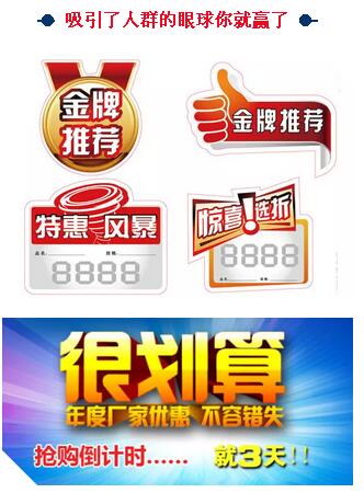 門店借鑒: 門店不管是平時還是有促銷活動時,都要充分利用音、像、圖、字、色等因素,影響行人,以吸引顧客進店消費。