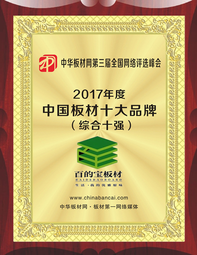 在品質上嚴格要求、在品牌形象上嚴格管理,兩手抓兩手硬的優(yōu)良作風讓百的寶板材獲得了不俗的市場口碑,并連續(xù)多年獲得“中國板材品牌‘榮譽。